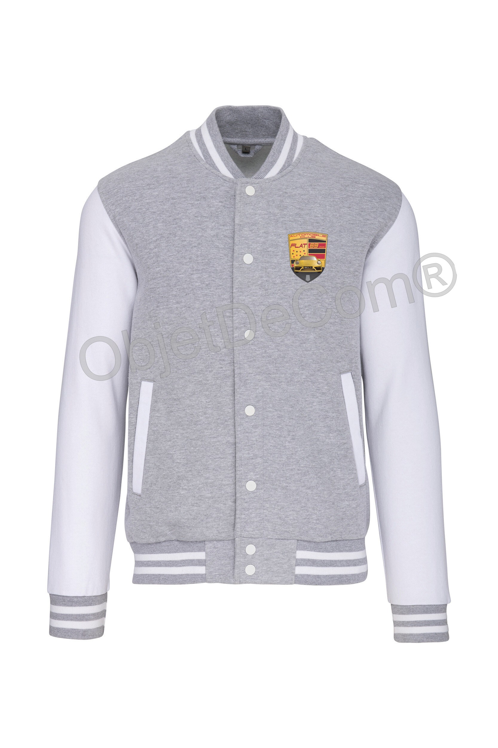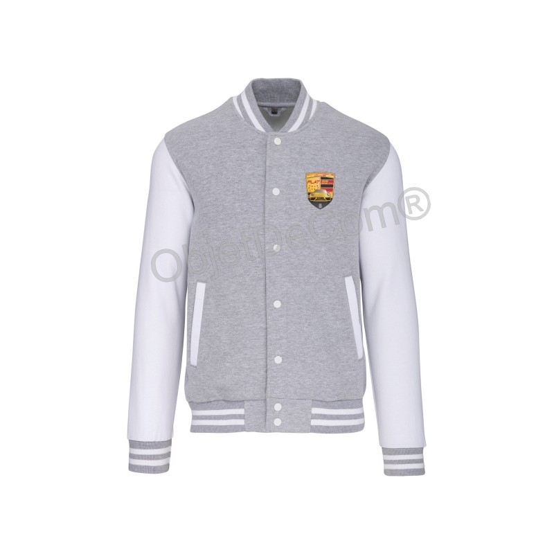 70% coton / 30% polyester. Molleton gratté 3 fils. Manches montées contrastées. Fermeture devant par boutons pression contrastés. Bord-côte avec 2 liserés contrastés au col, manches et bas de vêtement. 2 poches passepoilées contrastées devant. Bande de propreté en chevron et boucle d'accrochage à l'intérieur col.
