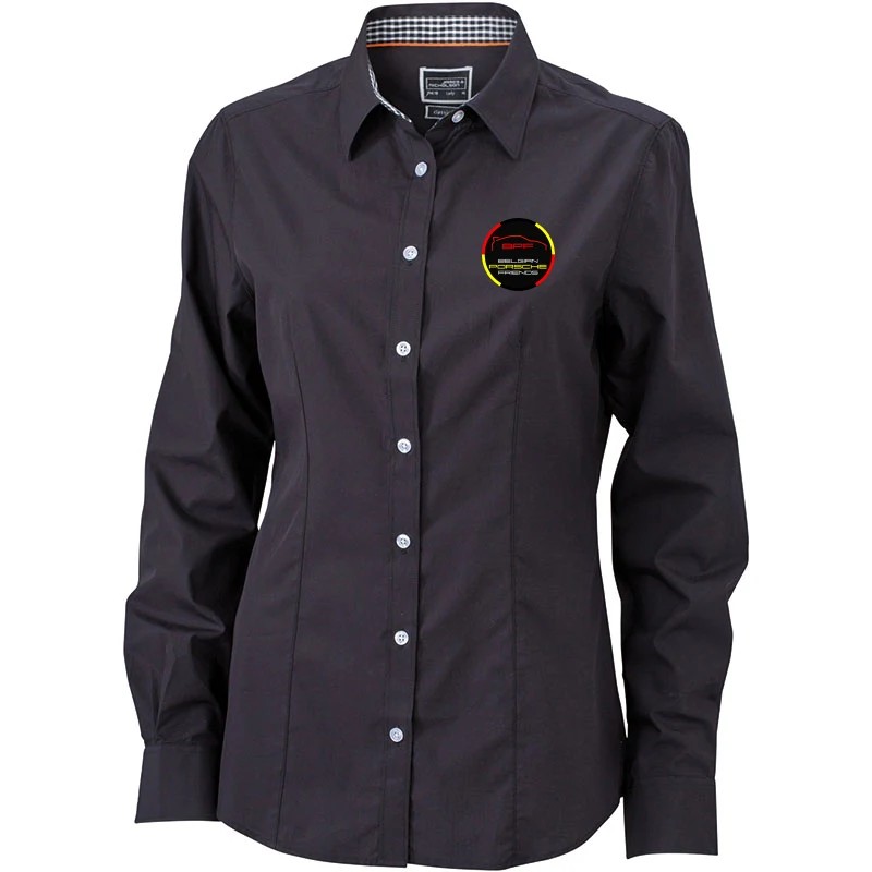 Chemise Femme Manches longues Col non boutonné Fermeture boutonnée nacrée Empiècements intérieurs Vichy au col et aux poignets Longues manchettes avec boutons de réglages Pli dorsal Coupe ajustée à base arrondie 100% coton popeline 100 gr/m² Traitement Easy care pour un entretien facile Personnalisé en broderie à l'unité