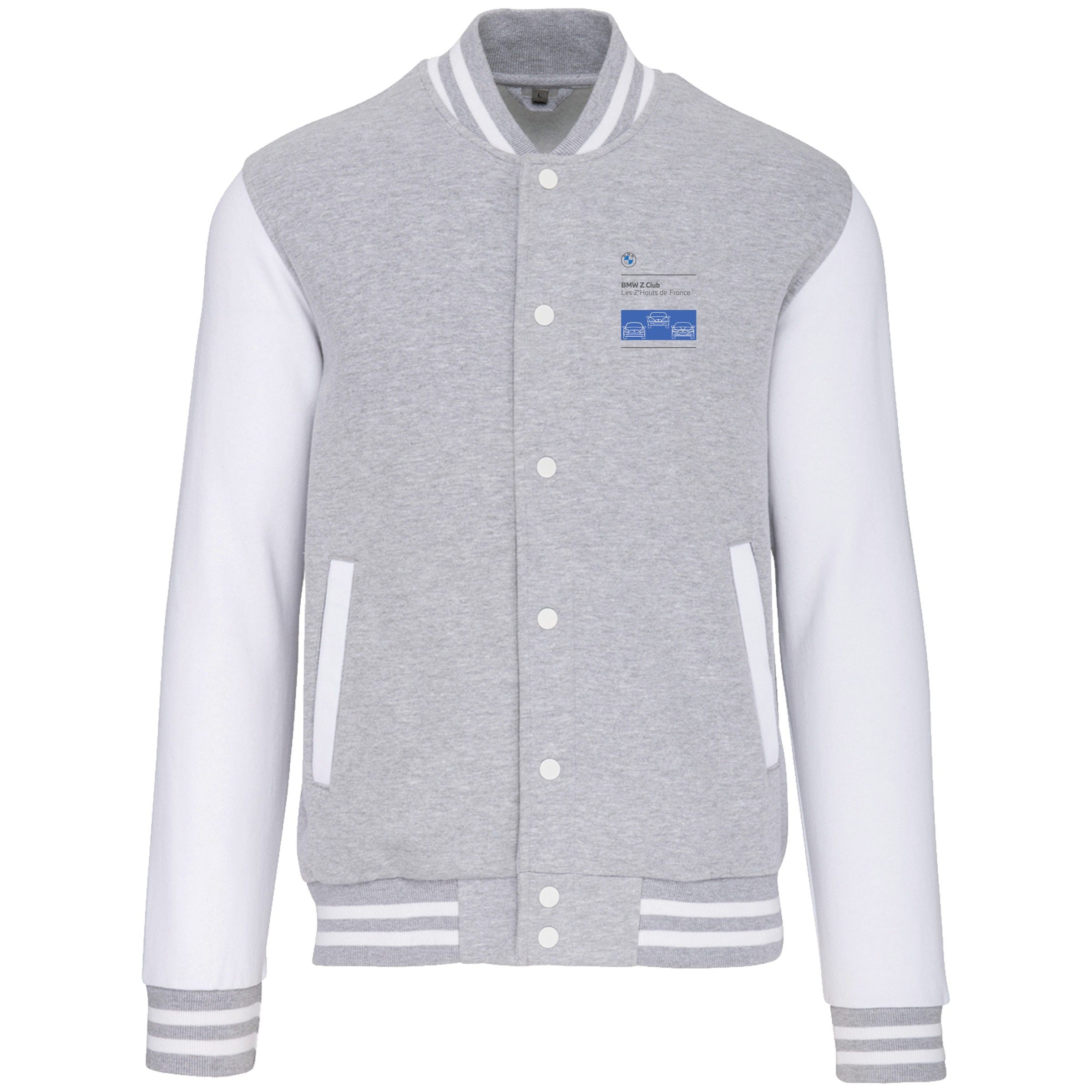 70% coton / 30% polyester. Molleton gratté 3 fils. Manches montées contrastées. Fermeture devant par boutons pression contrastés. Bord-côte avec 2 liserés contrastés au col, manches et bas de vêtement. 2 poches passepoilées contrastées devant. Bande de propreté en chevron et boucle d'accrochage à l'intérieur col.