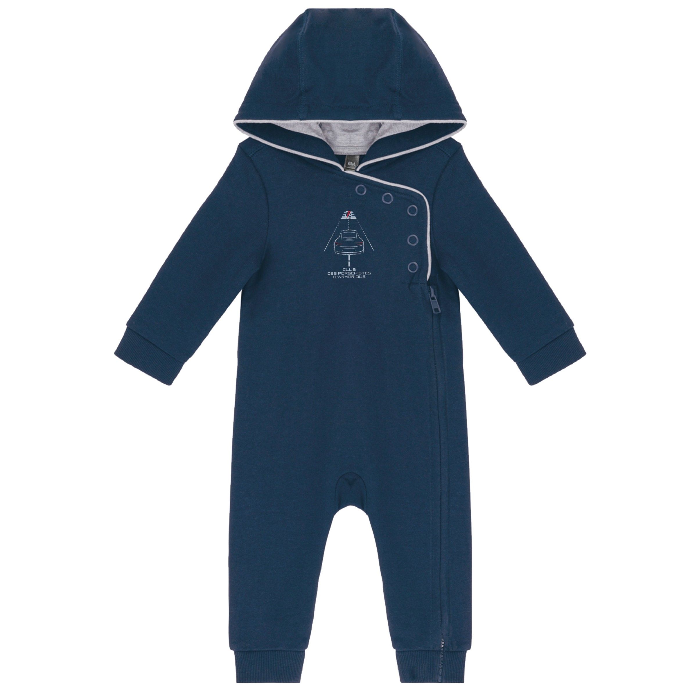 85% coton / 15% viscose pour tissu Oxford Grey, 100% coton pour tissu Navy. Molleton non gratté. Ouverture sur le devant avec zip et boutons pression. Intérieur de capuche contrasté. Bas de manches et de jambes en bord-côte.